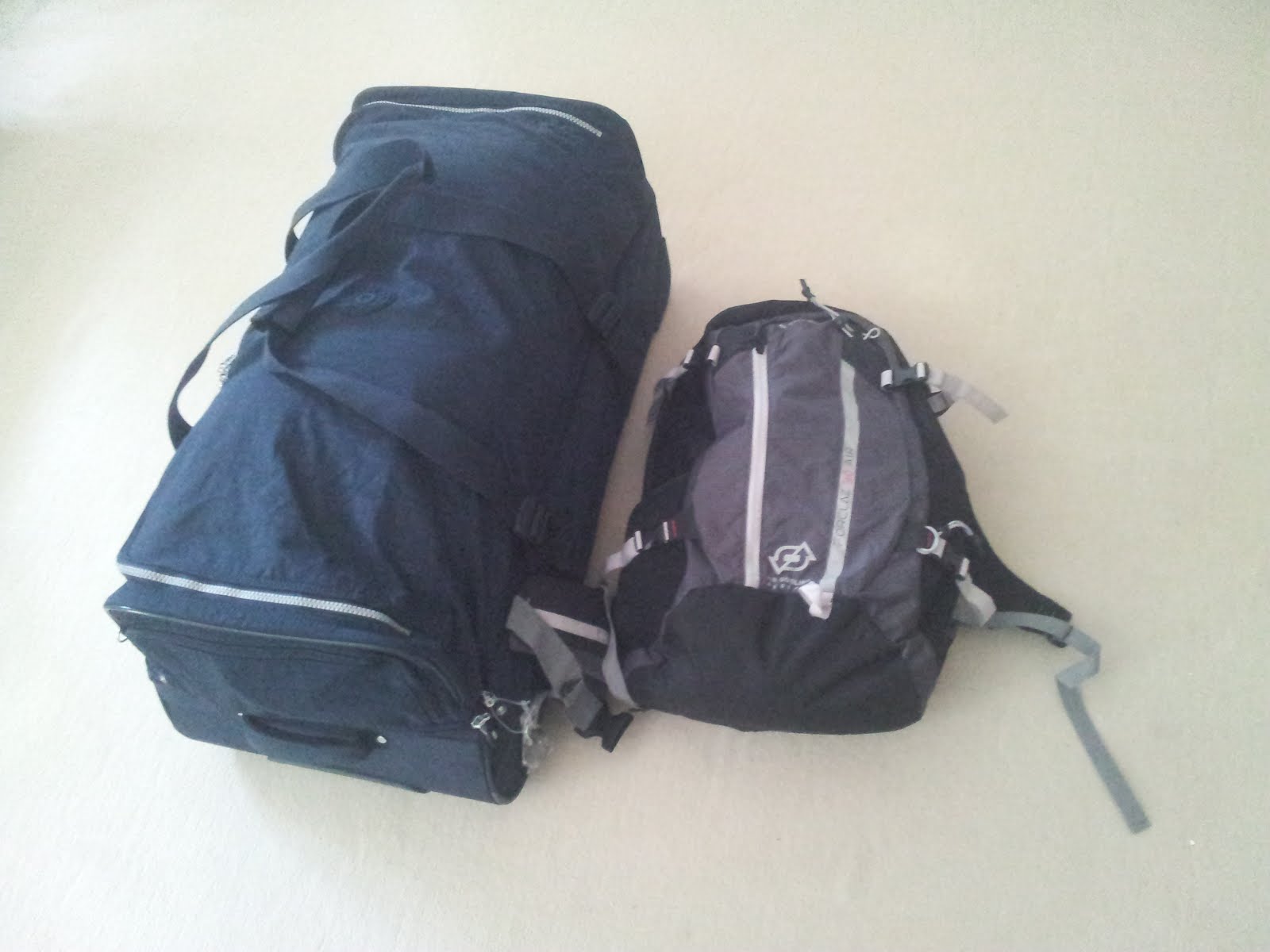 Voilà ci-dessus à quoi se résume notre capacité de bagage par personne, soit une sac à roulettes comprenant 16kg d’affaires (20kg en soute, poids du sac compris) et un sac à dos « cabine » dont le poids pourra aller jusqu’à 8 kilos.