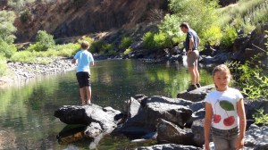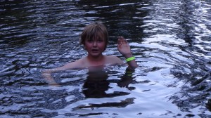 Végétation, faune, installations du village, nous parcourons et profitons encore quelques heures du site avant de reprendre la route direction le campground (pour la première fois nous logeons 2 nuits au même endroit), et nous arrêtons pour une baignade improvisée : courageusement Maëlle et Arthur se plongent dans l’eau glacée venant des chutes.
