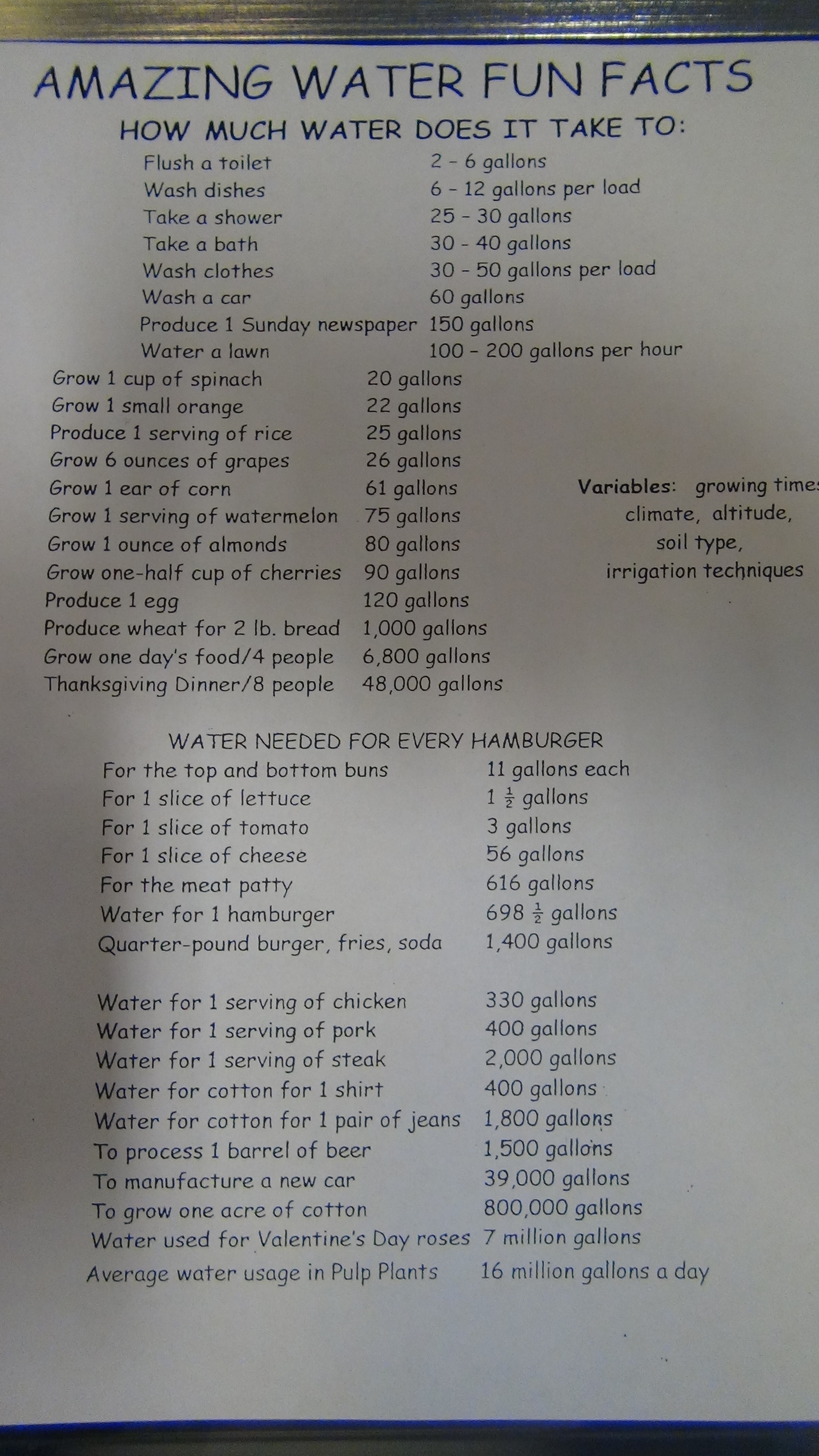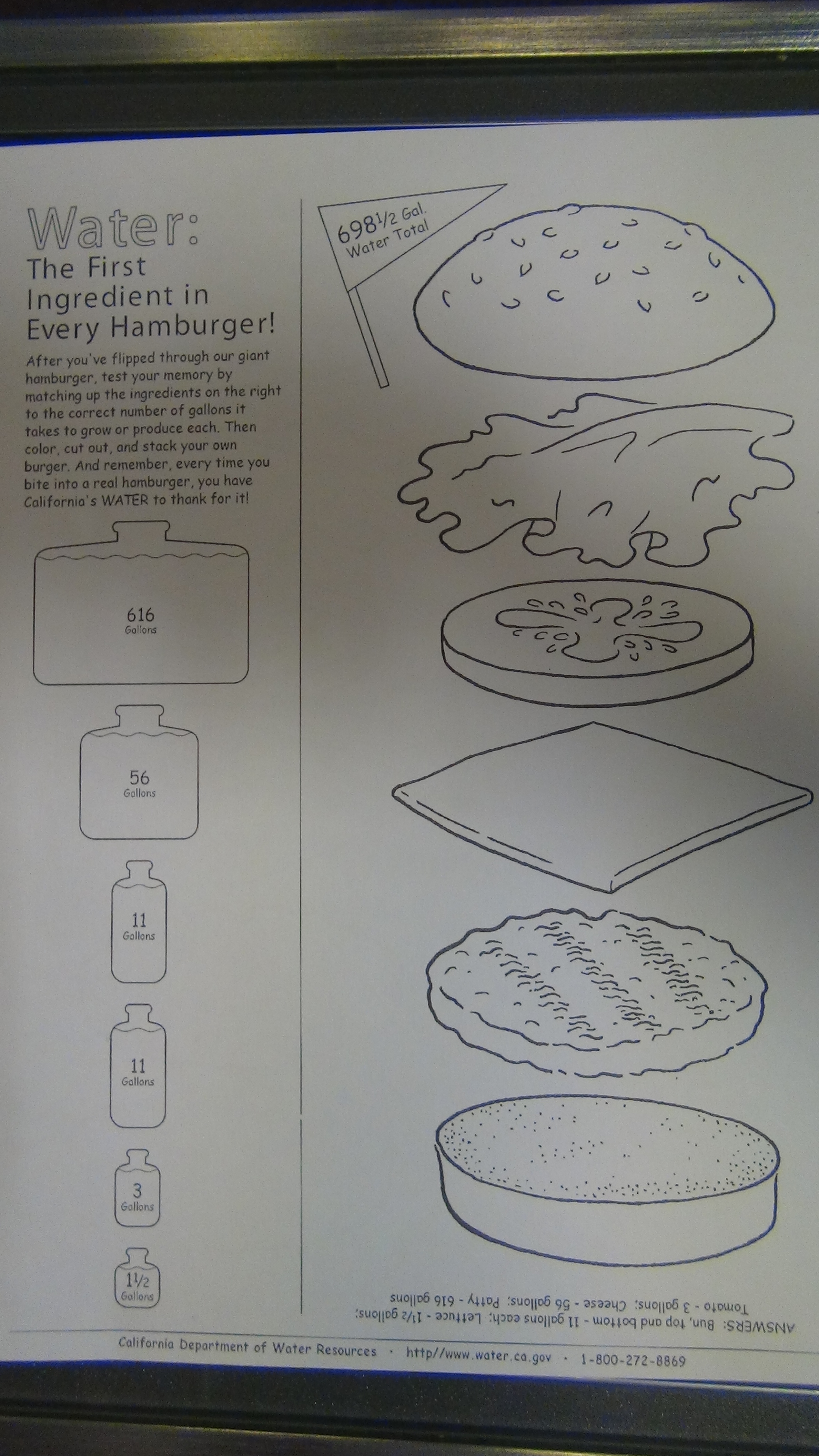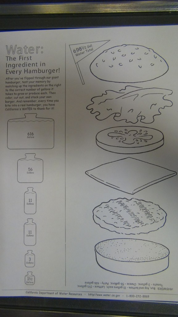 Nous y avons appris d’amusantes et instructives choses sur l’eau, son utilisation… (un gallon vaut 4 litres), et vous proposons entre autres ce petit jeu autour d’un hamburger, vous pouvez relier l’eau nécessaire à chaque partie du hamburger: