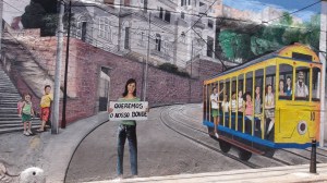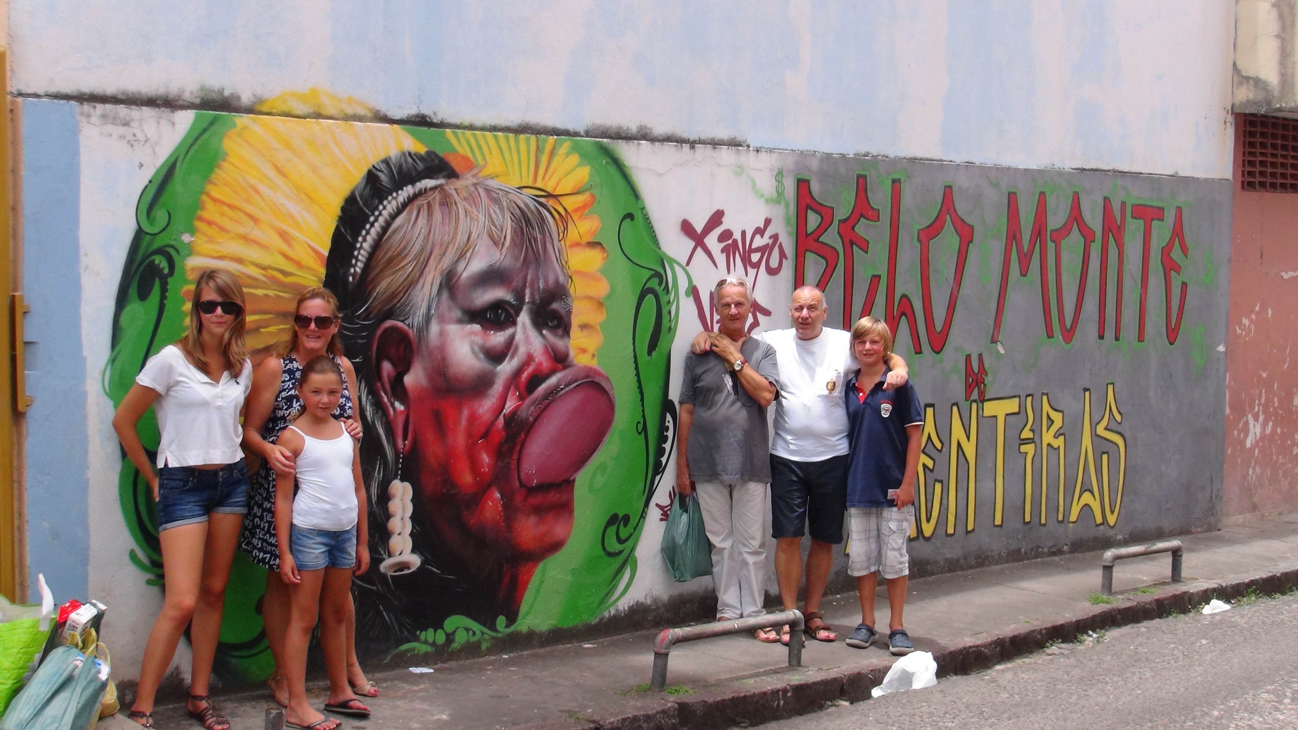 Toute l’équipe réunie devant une fresque de rue représentant le chef indien Raoni qui tente d’annuler la construction d’un barrage au Brésil. (http://www.raoni.com)