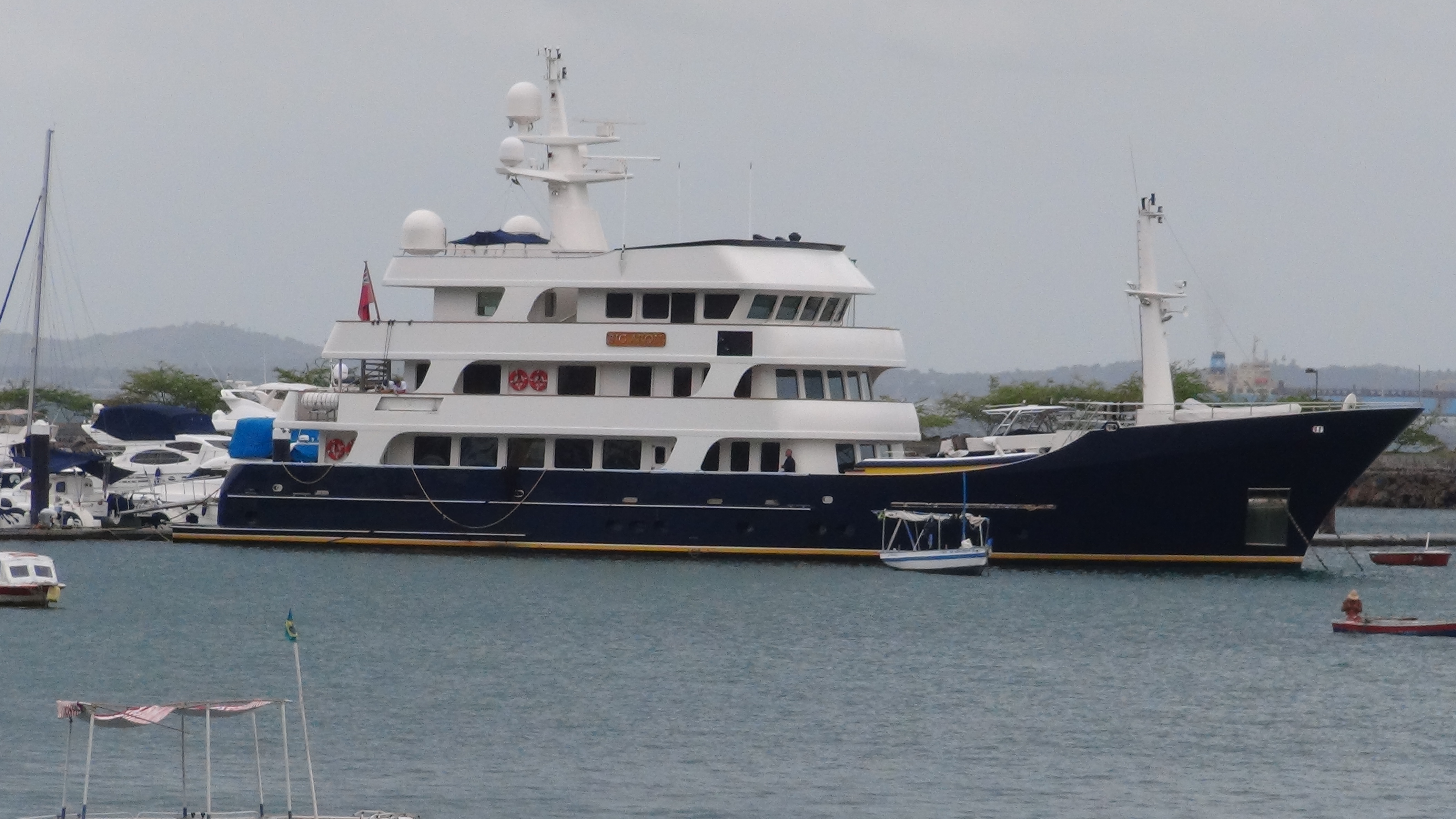 Pour les aficionados : Salvador semble être le port d’attache de Big Aron, un explorer magnifique de 45 mètres.