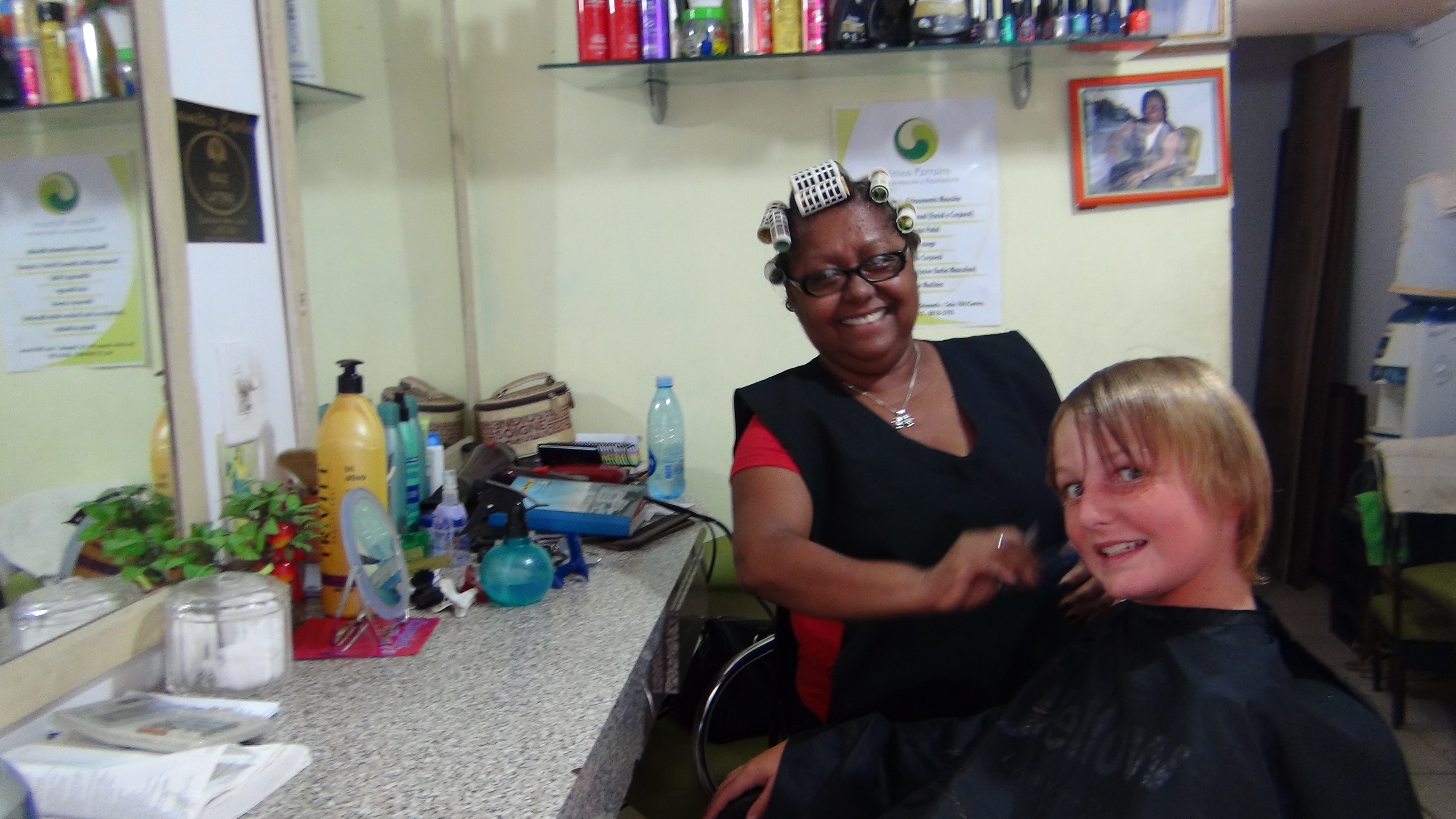 Arthur chez sa coiffeuse d’un jour ! Pour rentrer dans son échoppe il a fallu qu’elle ouvre les grilles verrouillées par un cadenas .. Très « customer friendly » !