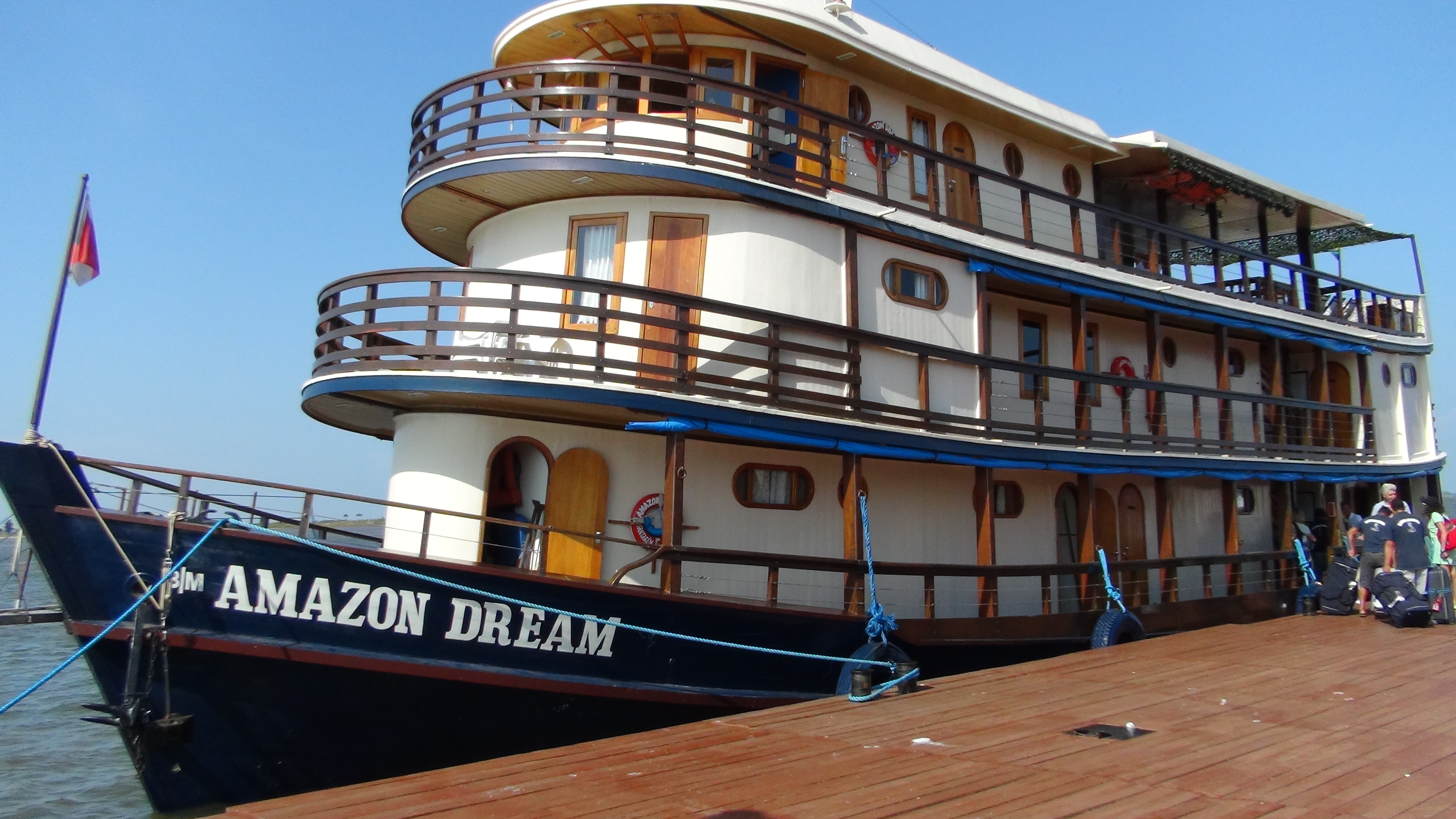 À notre arrivée, Bernard, l’armateur, nous reçoit à bord de l’Amazon Dream, et nous découvrons nos cabines situées à l’avant du premier pont. Autour de jus de fruits aux saveurs étonnantes, nous faisons connaissance de l’équipage, de Wilson, un guide brésilien de pure souche allemande et des passagers. Notre environnement est essentiellement francophone : armateur, majorité des passagers et certains membres de l’équipage qui s’appliquent à comprendre et répondre en français.