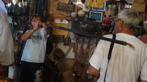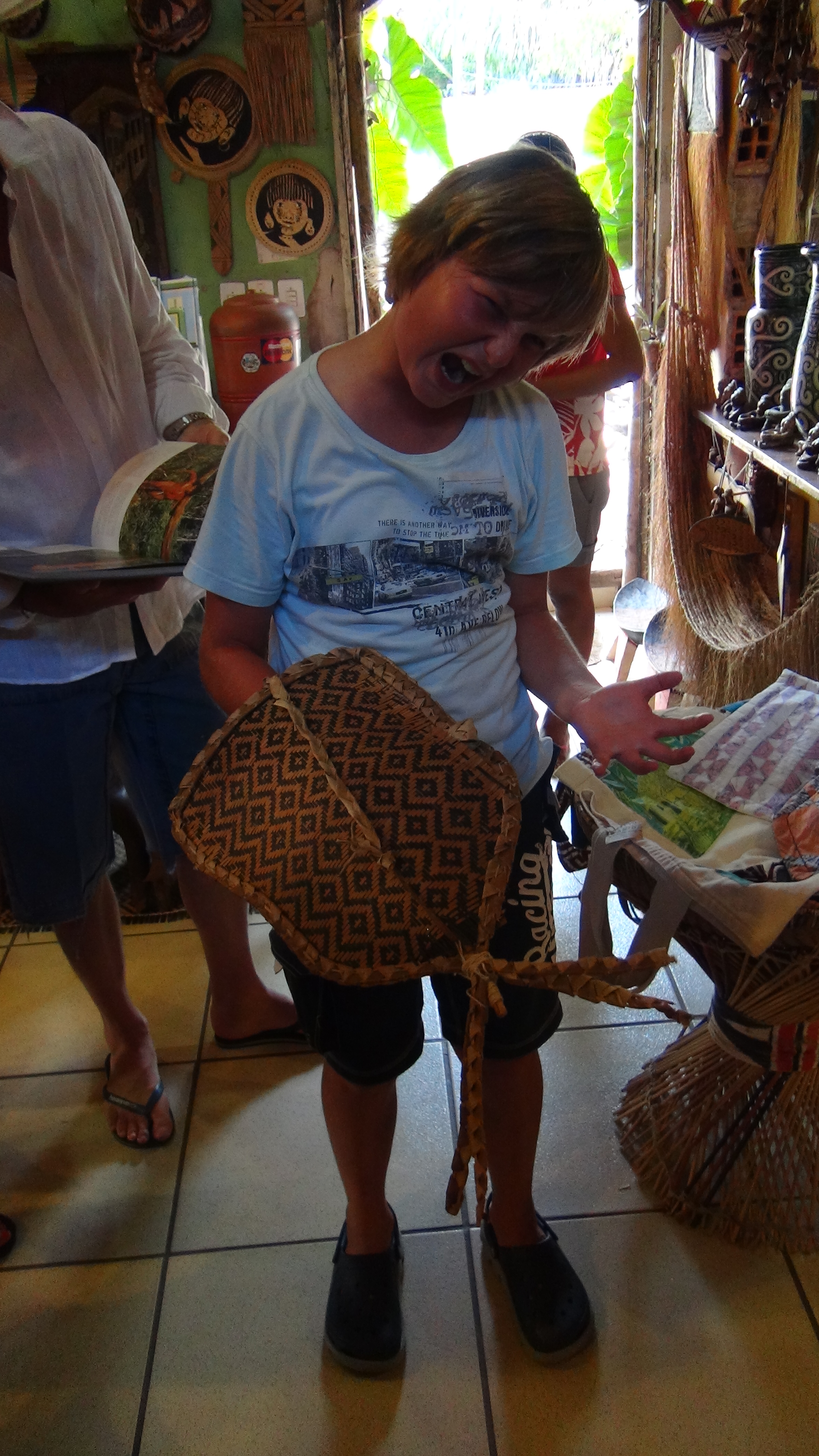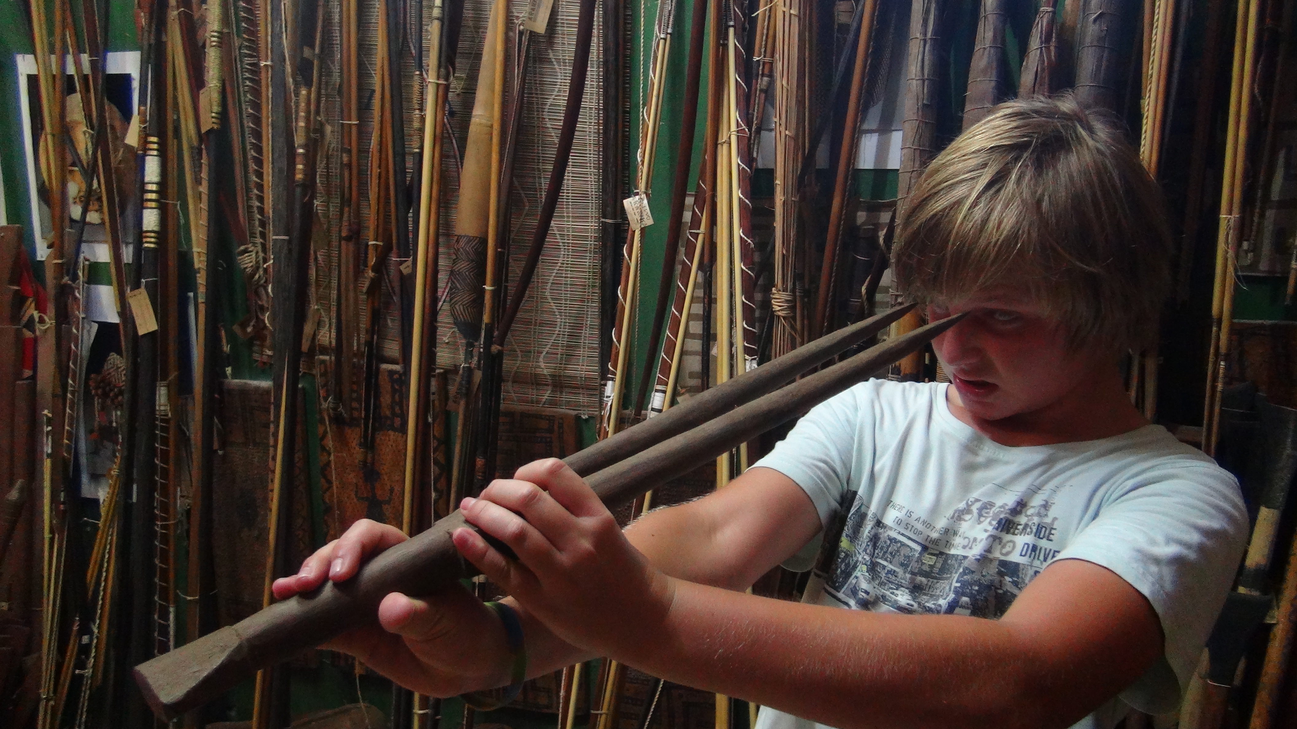 Nous découvrons à cette occasion les armes locales : casse-têtes, crève-yeux, lances, arcs, sarbacanes…