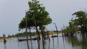 L’église à gauche (on y voit le niveau « haut » des eaux). L’école dans les 2 salles de droite. Un bateau assure le ramassage scolaire.