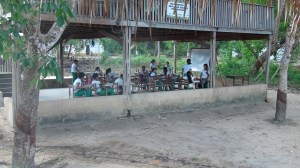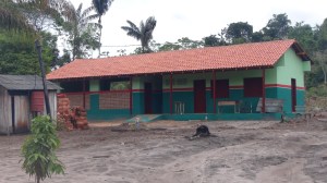 Un coup d’œil à l’artisanat local (des bijoux fabriqués avec les graines de la forêt) et nous traversons le village, depuis l’église où les mariages se célèbrent une seule fois par an, lorsque le prêtre vient, à l’unique et récente cabine téléphonique alimentée par panneau solaire (les rares appels sont pour l’hôpital, lorsqu’un accident ou une morsure de serpent surviennent, et l’ambulance, si elle vient, n’arrive pas toujours à temps…), en passant devant l’école : nous sommes ici en « zone d’éducation prioritaire », un professeur pour 6 élèves dans un bâtiment spacieux et fonctionnel. Le gouvernement fourni les uniformes et un repas pour tous.