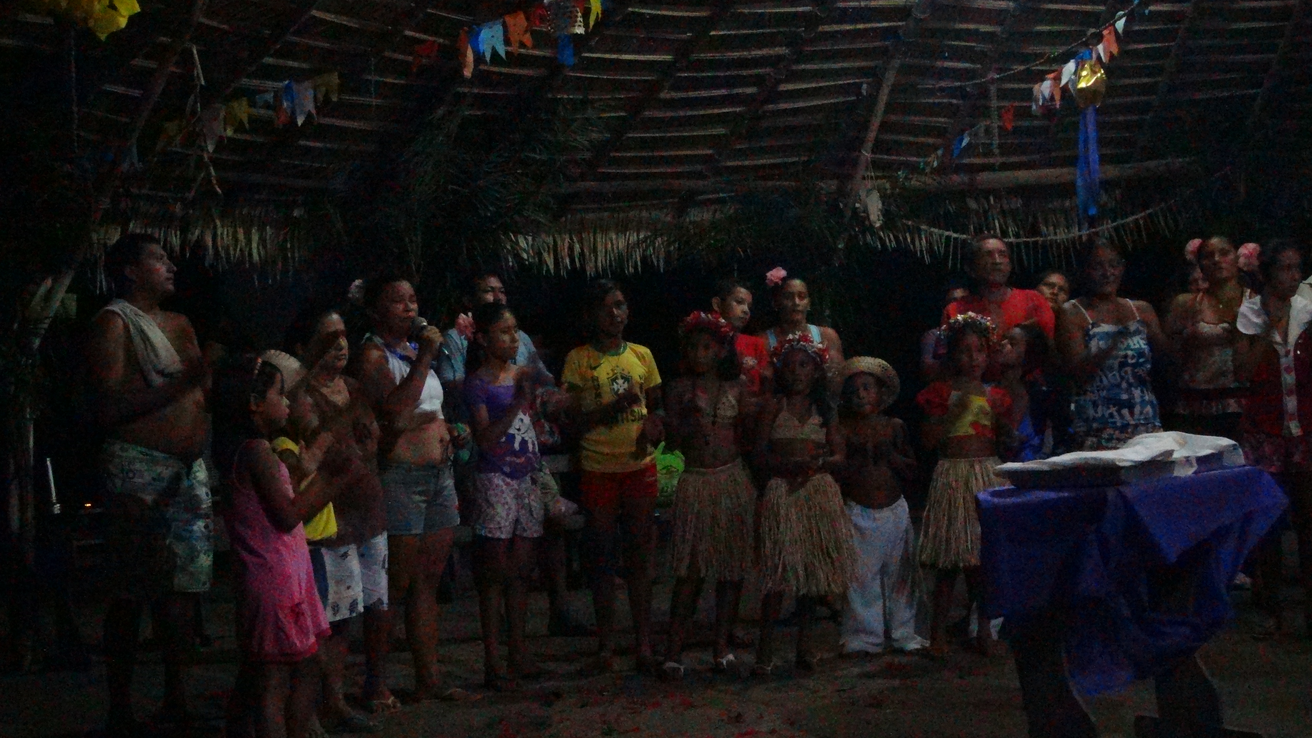 A la nuit tombée nous prenons les annexes >> ici << et zigzaguons dans les méandres de la rivière pour aller assister à la soirée donnée par les indiens : danse du tipiti et carimbo (danse officielle état du Para, le Para étant le nom de cette région). Mais admirez plutôt :
