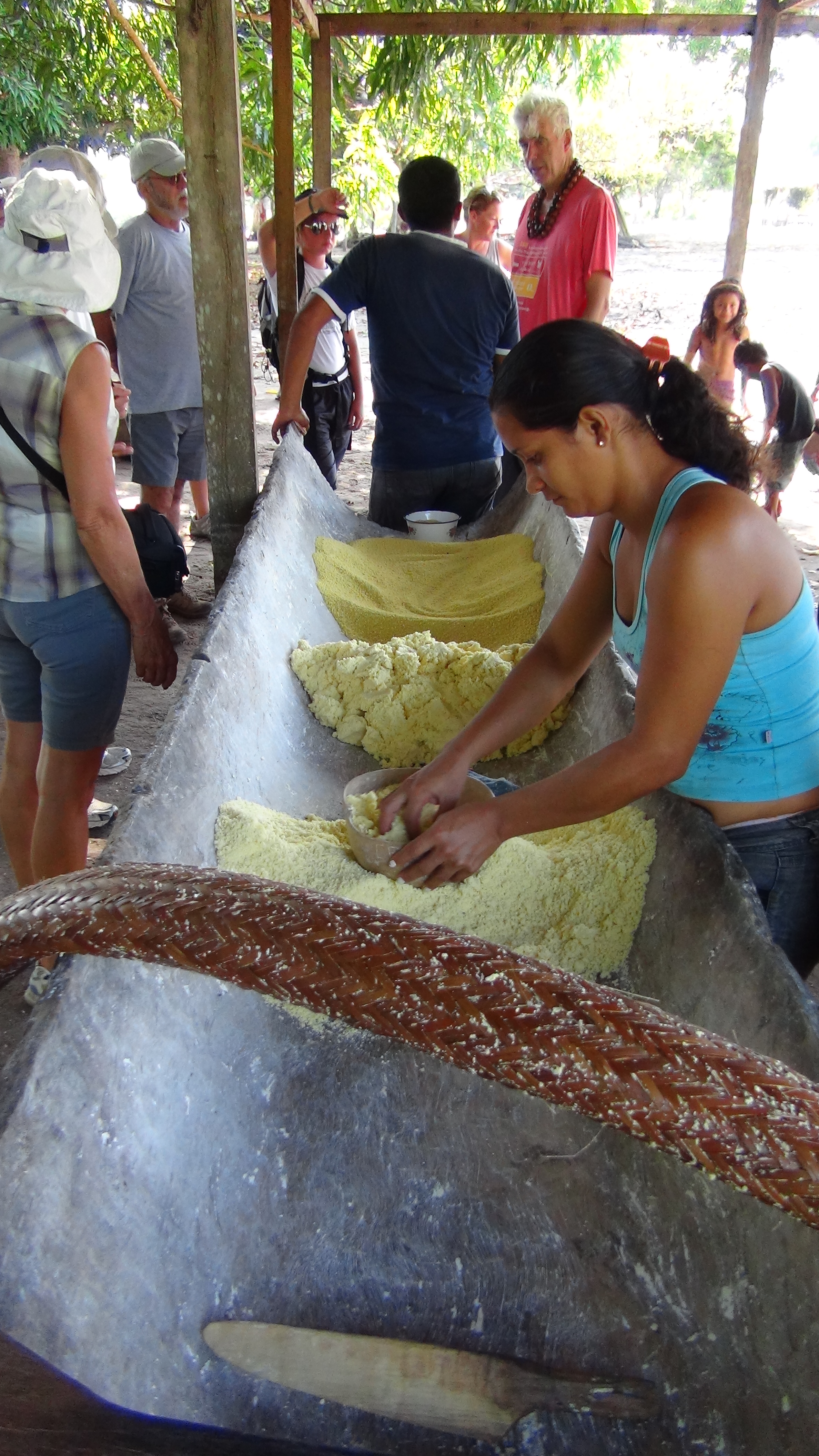 Au matin nous regagnons ce même village pour découvrir la vie quotidienne et la préparation de la farine de manioc, base de toute l’alimentation locale. Ce travail harassant est l’une des rares sources de revenu de cette tribu. Les sacs de 50 kilos sont vendus à un tarif élevé en ce moment, 100 reais (soit environ 38 €) contre seulement 20 reals l’an passé. La plantation du manioc est simple, il lui faut 6 à 7 mois pour pousser, le tubercule est arraché lors qu’il a la dimension d’une grosse aubergine et « traité » dans la journée : 7 à 800 kilos arrachés, épluchés, râpés, égouttés, tamisés puis séchés permettrons de remplir 4 ou 5 sacs… Les jours de récolte, toutes les générations sont réunies pour ce travail. Nous demeurons admiratifs et humbles.