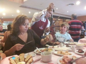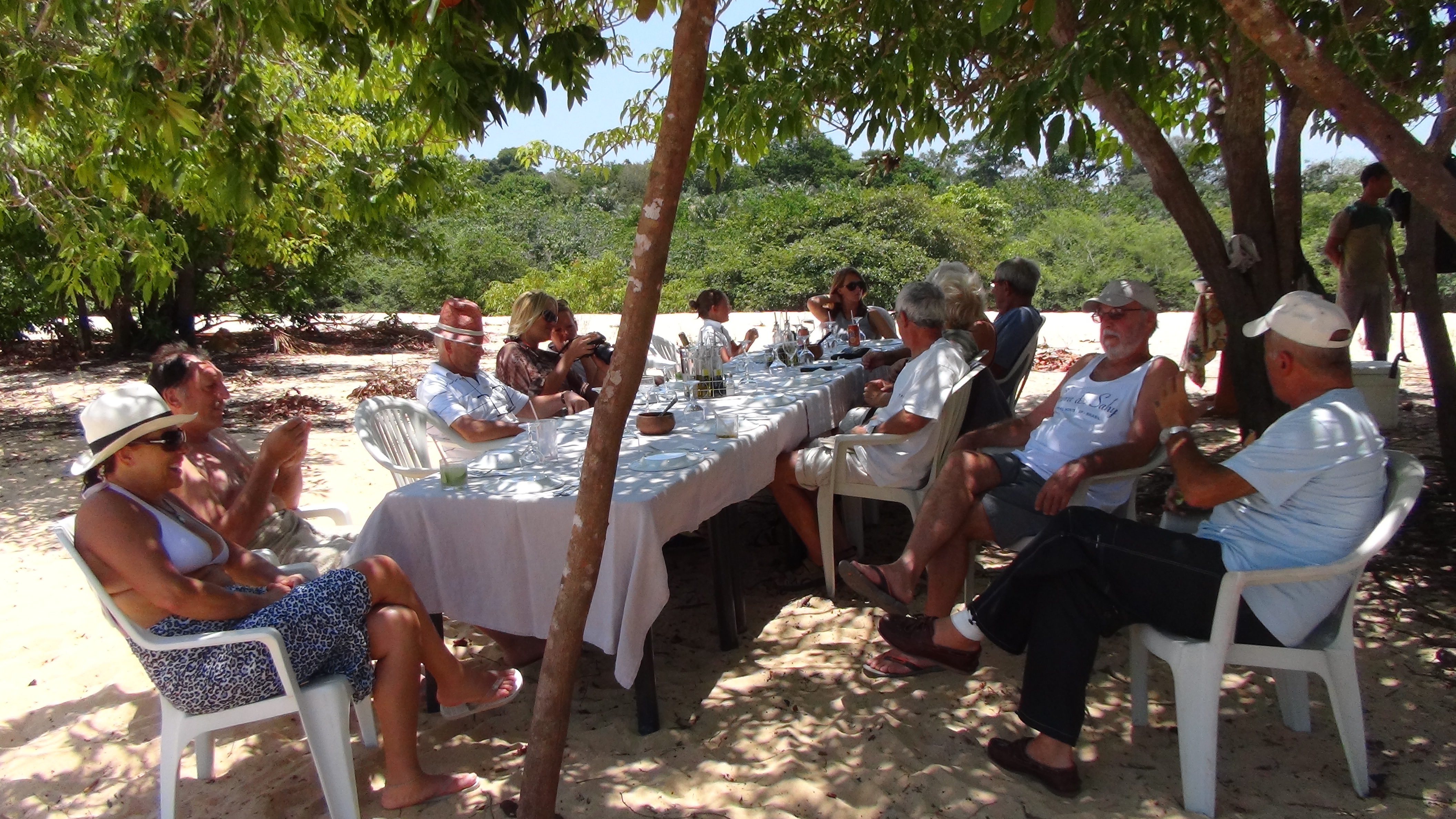 En notre absence l’équipage nous a préparé une nouvelle surprise, et c’est un déjeuner sur la plage qui nous attend, caipirinha, grillades de viande, ananas grillés. Les pieds dans l’eau ou à l’ombre des arbres, nous savourons ce moment partagé avec les 10 autres passagers, Bernard et Wilson, livrés aux bons soins de la cuisinière.