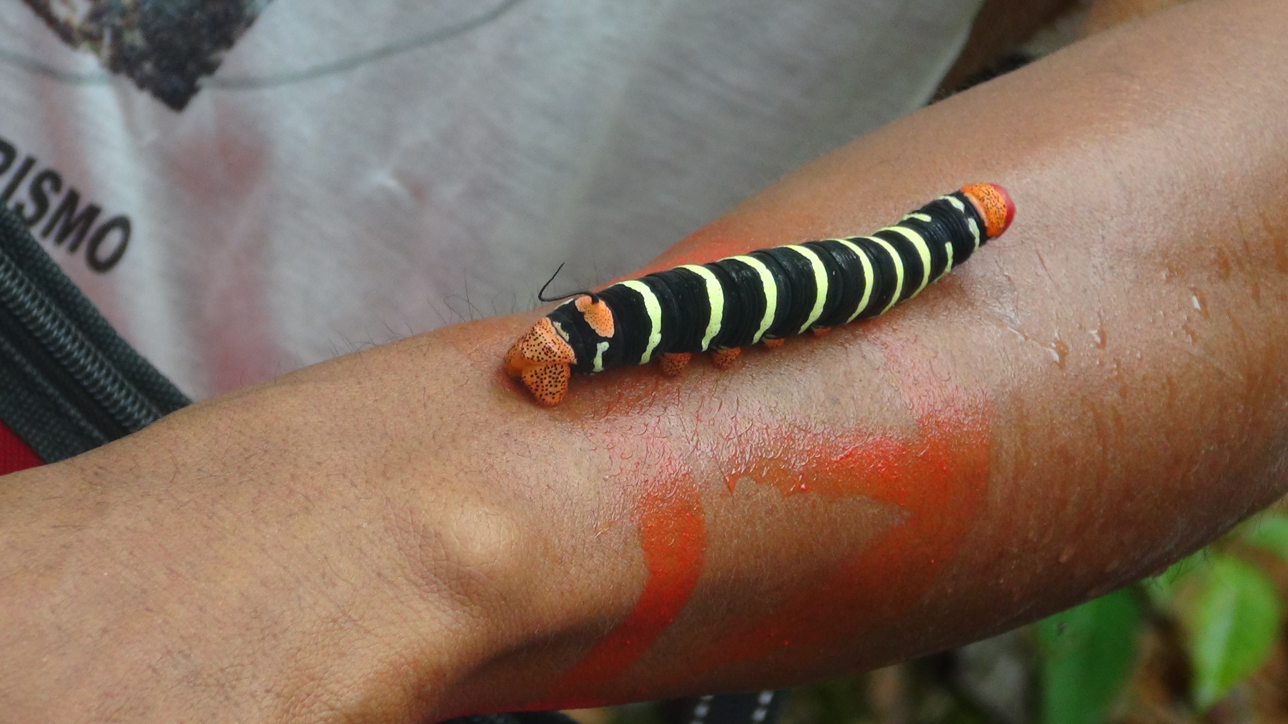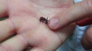 Voici la fourmi qui permet de réaliser des sutures : on la positionne sur la coupure, elle mort, et on lui coupe la tête qui restera sur la peau. Celle ci est morte, sinon il ne la tiendrait pas comme cela. Je me suis fait mordre à plusieurs reprises par des petites fourmis, je vous assure qu’à chaque fois, j’ai battu des record de vitesse pour enlever ma chemise et trouver la bête.