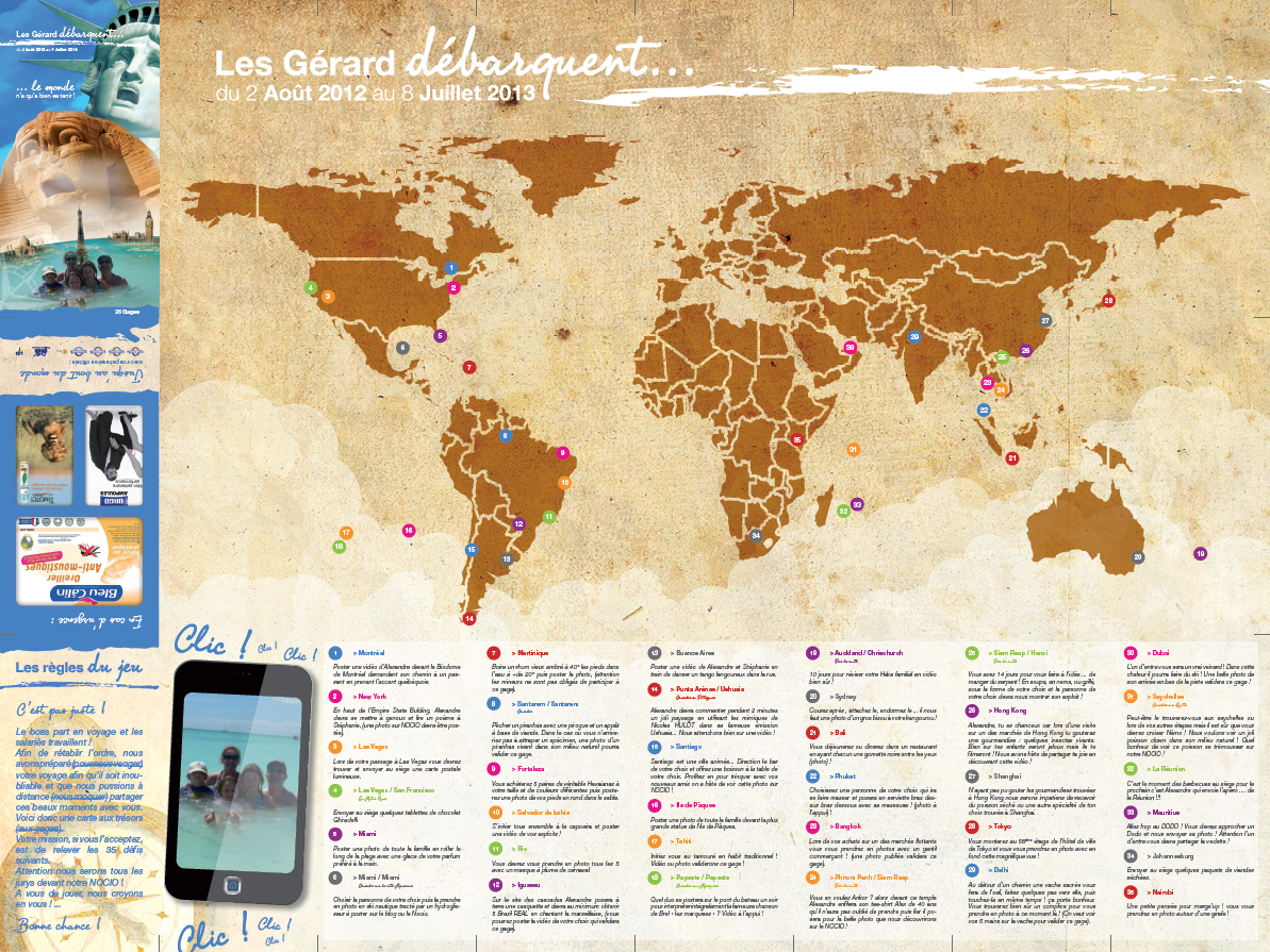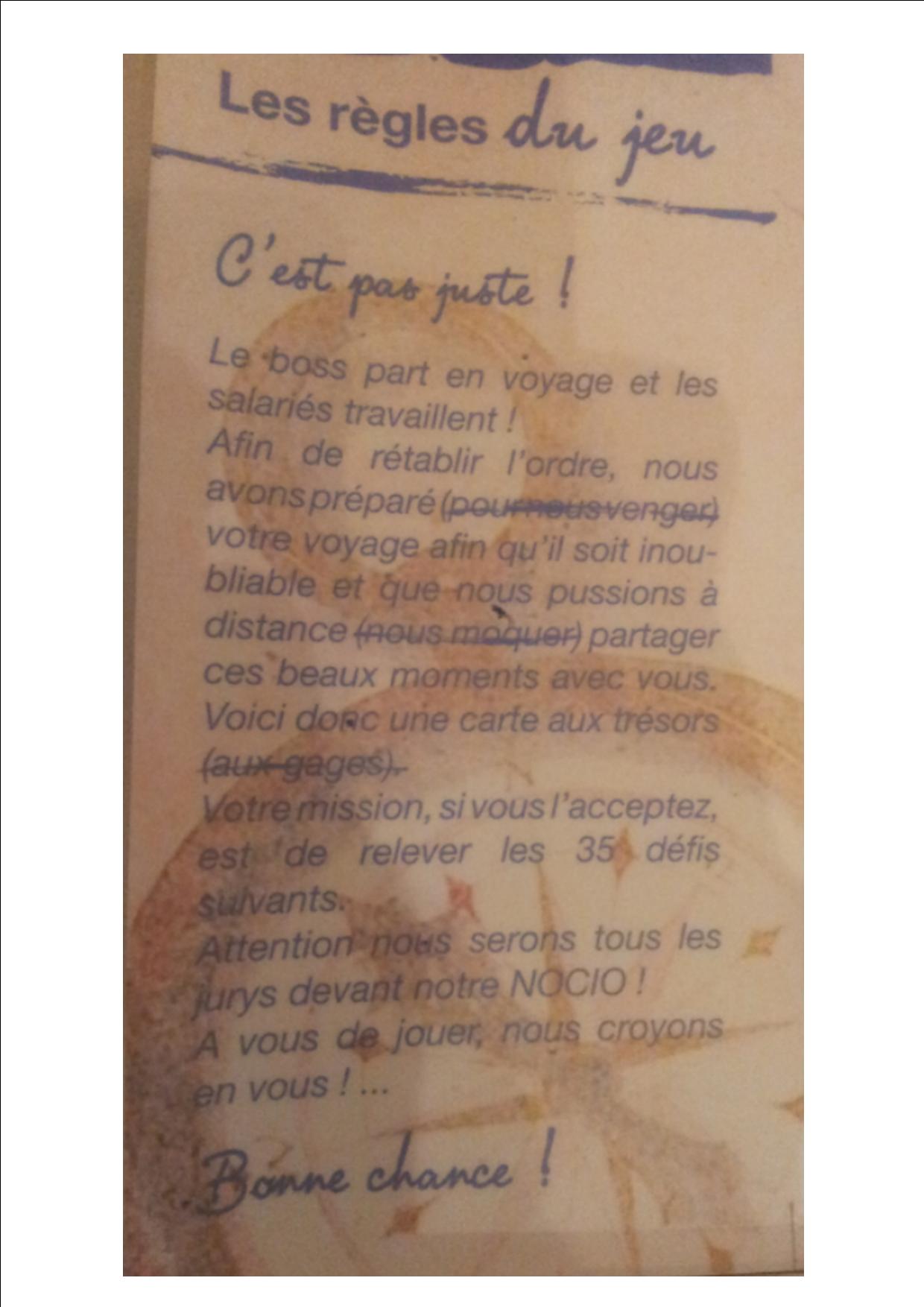 « C’est pas juste ! Le boss part en voyage et les salariés travaillent ! Afin de rétablir l’ordre, nous avons préparé (pour nous venger) votre voyage afin qu’il soit inoubliable et que nous pussions à distance (nous moquer) partager ces beaux moment avec vous. Voici donc une carte trésor (aux gages), votre mission, si vous l’acceptez, est de relever les 35 défis suivants. Attention nous serons tous les jurys devant notre NOCIO ! A vous de jouer, nous croyons en vous ! …. Bonne chance ! «